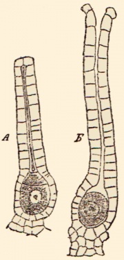 - ботаническое название женских половых органов у сосудистых споровых растений и у листоносных мхов. Внутри А. находится особая большая клеточка, так назыв. яйцеклетка, из которой после оплодотворения.происходит путем деления и разрастания сначала зародыш, а затем целый новый организм растения, или индивид. Слово образовано от греч. άρχή - начало, γένος - роль, т. е. поколение, зачаток нового поколения, родоначалие. По большей части А. имеют вид бутылкообразных или грушевидных образований с расширенною нижнею частью, содержащею яйцеклетку, и узкою верхнею, имеющею канал по длине, в который и проникают мельчайшие "живчики", или "сперматозоиды", из мужского органа, "антеридия", того же растения. У папоротников А. преобразуются в новые растения, приносящие споры на нижней стороне листьев, а у мхов - в плодовые коробочки, наполненные спорами. В новейшее время стали называть А. - также и женские органы у хвойных растений, по значительному сходству в некоторых существенных чертах со споровыми растениями.