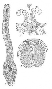 Архегоний (греч.), в ботанике, женский половой орган,характерный для высших споровых растений — мхов, папоротниковых и хвойных. Обычно А. состоит из многих клеток, имеет грушевидный и бутылкообразный вид с расширенной нижней частью, где находится яйцеклетка, и узкой верхней; в последней находится канал, по которому проникают в А. к яйцеклетке «сперматозоиды», или «живчики», из мужского органа растения (антеридия). После оплодотворения яйцеклетка путем деления и разрастания дает зародыш, а затем новое растение.
