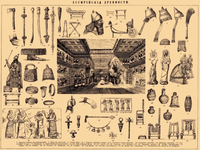 Ассирийские древности, находящиеся в Луврском и Британском музеях, дают понятие о всей совокупности культурной жизни древней А. Средоточием всех изображений является царь, его свита, царедворцы, жрецы и солдаты. Он изображается в тиаре, длинной, богато украшенной галунами тунике, двойной затканной или вышитой мантии, расходящейся с левой и правой стороны, обнаруживая нижнюю тунику; в правой руке держит скипетр, в левой украшенный меч, всегда в горизонтальном положении. Почти на всех изображениях присутствуют толстые безбородые евнухи, пользовавшиеся большим почетом и нередко занимавшие должности жрецов. Обыкновенно они держат над головою властителя зонтик или опахало из перьев. Особенно тщательною отделкою отличаются волосы на голове и бороде. Все лица ассир. государей имеют одно и то же выражение деспотической суровости, без всякого различия по отношению к изображаемому действию: сражению, жертвоприношению или охоте. Ассирийская государственная жизнь теснейшим образом связана с мифологией и культурой страны. Царь получал свое имя от богов; как он, так и его слуги приносили жертвы богам; он обращается к содействию богов, приступая к какому бы то ни было действию, совершаемому их именем или под их покровительством. Религия весьма сходна с тою, которая исповедовалась в Вавилоне. В ассирийских надписях замечаются имена 7, а позднее 12 главных божеств, во главе которых стоял еще, сверх того, бог Ассур. Имена этих 13 богов следующие: Ассур, Ану, бог земли, Бэль-эль — демиург и отец богов, бог моря, Бин, Ян, Ану — бог дождей, Небо — начальник небесных войск, позднее называвшийся Меркурием, Нинип-Самдон-Геркулес, Нергал — бог войны, Самас — солнце, Син — луна, Таоат — мать богов, Истар — богиня войны и любви. Истар впоследствии расчленяется на несколько богинь. Планеты считались также божествами, равно как и многие силы природы. Колоссальные быки и крылатые львы изображали собою божества низшего порядка. В национальном боге Ассуре нельзя не узнать Зороастрова Ормузда. Совершенно неизвестен был в Вавилоне бог добра. Ему не посвящен ни один из 12 месяцев и предоставлен лишь 13-й, вставной, месяц. Культ был обставлен с большою пышностью, вообще отличавшею ассирийский быт. Жрецы носили роскошные одежды. В тщательно убранные волосы вплеталась богато изукрашенная лента. В правой руке они держали обыкновенно растение с тремя ветвями и тремя цветками. Растение принадлежало, по-видимому, к виду лотоса. К числу обычных проявлений ритуала принадлежат поклонение символическому чудесному дереву. Несравненно чаще, чем изображения религиозных обрядов, встречаются на ассирийских памятниках изображения сражений. Царь всегда принимал участие в войне. Войска имели разнообразные одежды. Некоторые воины носили чешуйчатые панцири. Собственно боевой порядок был неизвестен. Главная военная сила заключалась в прекрасной коннице и в боевых колесницах. Штурмы, нередко изображаемые на памятниках, велись при помощи лестниц, таранов и т. п. Переправы совершались на ладьях и связанных кожаных мехах. Судьба побежденных была печальна. Они подвергались сажанию на кол, сдиранию кожи, вырыванию языка и т. д. Других массами отправляли в ссылку. На памятниках встречаются изображения подобных сцен. Царь с большим торжеством вступал в покоренные места. Из охот обыкно