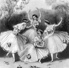 В 1831 г. Дидло оставил пет. сцену из-за неприязненных отношений к нему директора театров кн. Гагарина. Уход его сильно отразился на положении балетного дела. Вскоре вниманием столицы овладевает Мария Тальони. Эта 4-я грация, как ее называли, дебютировала в балете «Сильфида» (6 сент. 1837 г.) и вызвала неописуемый восторг. Такой легкости, такой целомудренной грации, такой необыкновенной техники и мимики еще не видывали ни у одной из танцовщиц. В 1841 г. она распростилась с Петербургом, протанцевав за это время более 200 раз. В 1848 г приезжает Фани Эльслер, соперница Тальони — знаменитая своей грацией и мимикой. Вслед за Эльслер посетила Петербург Карлотта Гризи. Дебютировала она в балете «Жизель» (1851 г.) и имела большой успех, выказав себя первоклассной танцовщицей и прекрасной мимической актрисой. Танцевала она в СПб. до 1853 г., когда взамен ее были ангажированы 3 прима-балерины: Флери, Гиро и Иелла, которых с Гризи даже cpaвнивать нельзя. Балетмейстеры: Огюст, Блаш, Титюс, Тальони (отец), Перро, Петипа, Мазилье последовательно ставили роскошные балеты и привлечением талантливых артистов старались выдвинуть балетные представления, к которым начинали охладевать благодаря итальянской опере; балеты в 1850 годах давались только по воскресеньям на сцене Большого театра и посещались, главным образом, только присяжными балетоманами. Из танцовщиц этой эпохи отметим: Прихунову, Ришар, Амосовых 1-ую и 2-ую, Санковскую Макарову, Никитину, Радину, Снеткову, Шлефохт, Суровщикову, также и др.; из танцовщиков выдавались: Алексис, Фредерик, Флери, Гольц, Герино (1834-36 гг.), Иогансон, Стуколкин, Петипа (с 1847 г.), Перро (1848 г.), Кшесинский (1853 г.) и др. О балетах 40-х годов наш знаменитый критик В. Белинский нередко писал критические статьи; так, он писал: о Тальони, Герино и Санковской.