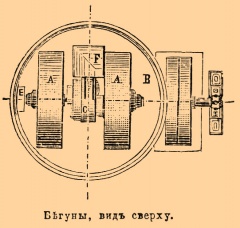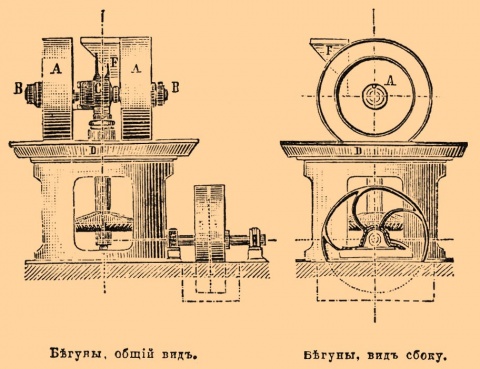 На прилагаемых рисунках изображена обыкновеннейшая форма бегунов в плане и с двух сторон в фасаде, причем: AA означает самые Б.; BB — горизонтальную ось, на которой они надеты; D — корыто или лежень (из чугуна, камня и др. материалов), на котором помещается измельчаемый материал; F — воронку для засыпания измельчаемого материала, и E — отверстие для выгребания измельченного.