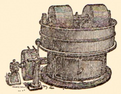 (Meules verticales, Läufermühle, Kollergang, Müll, verticalmill). — Некоторые заводские материалы для своего применения в дело должны быть превращены в порошкообразное состояние; так, например, селитра, сера и уголь для пороха; фосфориты для удобрений; глина, графит, шамот (см. это слово и Огнепостоянные материалы, Тигли), земля, служащая для формования в литейных, и т. п. Для этого служат не только толчеи, горизонтальные и вертикальные мельницы, валы с зубцами или кулаками и т. п. механизмы, но и бегуны, или дробильные мельницы. Они состоят из двух тяжелых дисков — каменных, чугунных, бронзовых (при приготовлении пороха), стальных или, наконец, деревянных, на которые надет только чугунный или стальной обод. Диски эти соединены между собой горизонтальной осью, на которой они могут свободно вращаться, и стоят в чугунном кольцеобразном корыте (франц.: piste au auge). Горизонтальная ось дисков пропущена в прорезь вертикальной оси, которая посредством зубчатых колес и приводов от какого-либо двигателя получает вращение и тем, увлекая за собой горизонтальную ось, заставляет диски катиться по дну корыта. Диски располагаются так, что один из них идет ближе к наружному, а другой к внутреннему закраю корыта или лежня, по которому катятся бегуны. На горизонтальной же оси закреплены гребки, которые, вращаясь вместе с дисками, отгребают растираемую массу от закраев к середине дна корыта, причем измельчаемое подвергается еще более мелкому дроблению и в то же время перемешивается. Горизонтальный вал делает обыкновенно от 10 до 60 оборотов в минуту. Бегуны делаются от 2 до 7 футов диаметром при ширине от 6 до 18 дюймов. Смотря по величине дисков, по их весу и по измельчаемому материалу, бегуны требуют для своей работы от 2 до 4 и даже до 5 паровых лошадей.