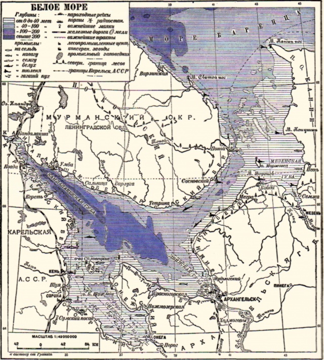 Белое море, вдается с севера в материк Европы. Площадь — 95 тыс. км2. Наибольшая длина — 587 км. Состоит из: 1) сев. части, соединяющейся с Баренцевым морем; 2) узкой средней части (горла) от 45 до 55 км ширины и 3) юж. части (главного водоема). Берега Беолого моря имеют местные названия (Терский, Кандалакшский, Карельский, Поморский, Онежский, Летний, Зимний). Зап. берега большей частью каменисты, восточные — сложены из более мягких пород. Образует 4 больших залива: Мезенский, Двинский, Онежский и Кандалакшский, вдоль берегов к-рых встречается ряд островов. Заливы, за исключением Кандалакшского, мелководны. Вода мало соленая (2,5—3%). Климат суров, с частыми туманами. Зимой прибрежные части моря замерзают. Вполне свободно от льдов Б. м. около 5 мес. Приливы высоки и в сев. части достигают 5—6 м, в главном водоеме — 1—2 м высоты. В Б. м. впадает ряд болыш. рек: Мезень, Сев. Двина, Онега и др. Б. м. богато рыбой и тюленями, ловят сельдь, навагу, семгу. В горле и в сев. части развиты тюленьи промыслы. Многочисленные птицы дают жителям яйца и пух. Важнейшие порты: Архангельск, Кемь, Сорока, Онега, Умба, Мезень.