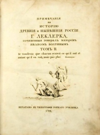 Болтин, Иван Никитич (1735—92), один из лучших знатоков русской истории в 18 в., пытался выявить законы историч. развития, автор «Примечаний на историю древния и нынешния России г. Леклерка» (2 тт.) и др.