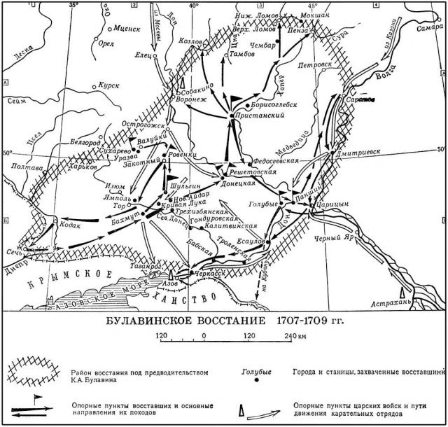 Булавинское восстание 1707—09, антифеодальное крестьянско-казацкое движение в России, вызванное феодальной эксплуатацией. Названа по имени К. А. Булавина. Шло под лозунгом уничтожения тех, кто «неправду делает»: бояр, воевод, «начальных людей». Основными движущими силами были «показачившиеся» беглые крестьяне. Активное участие принимали мелкие посадские люди и угнетённые народности — татары, мордва и др. Непосредственным толчком к восстанию явились действия карательного отряда князя Ю. В. Долгорукого, посланного на Дон для сыска и возврата беглых. В ночь на 9 октября 1707 свыше 200 человек во главе с Булавиным у Шульгинского городка на р. Айдаре уничтожили одну из партий карателей. Восстание быстро распространилось по городкам верхнего течения Дона. Против повстанцев были двинуты отряды зажиточных казаков и калмыков. В бою на р. Айдаре, близ городка Закотного, повстанцы потерпели поражение, Булавин с несколькими приверженцами бежал в Запорожскую Сечь. Первые вспышки восстания были подавлены. С конца 1707 начался 2-й этап Б. в. Центром движения стал Пристанский городок на р. Хопре, куда в марте 1708 приехал Булавин. Отсюда рассылались «прелестные» письма с призывом к восстанию. Восстание быстро распространилось на Верхнеломовской и Нижнеломовской уезды, Левобережную и Слободскую Украину. В начале апреля Булавин двинулся к Черкасску — административному центру донского казачества. 9 апреля 1708 в бою на р. Лисковатке, ниже Паншина, он разбил войско атамана Л. Максимова; рядовые казаки перешли на сторону восставших. 1 мая произошло восстание в Черкасске, и город почти без боя перешёл в руки повстанцев; Максимов и 5 старшин были казнены, имущество старшин и церковная казна распределены среди повстанцев, установлены пониженные цены на хлеб. 9 мая Булавин был избран войсковым атаманом. Организуя поход на Москву, он стремился заручиться помощью запорожских и кубанских казаков, раскольников, Ногайской Орды; пытаясь прекратить движение царских войск на Дон, отправил письмо Петру I. На Волгу направил отряды атаманов И. Некрасова, И. Павлова, Л. Хохлача. 12—13 мая 1708 они взяли Дмитриевск, 26 мая осадили Саратов, но овладеть им не смогли и двинулись на Царицын, который захватили 7 июня. Отряды атаманов С. Драного, Н. Голого и С. Беспалого отправились на Северный Донец и Слободскую Украину и в ночь на 8 июня 1708 на р. Уразовой разгромили Сумский полк. Главные силы Булавин выставил против Азова. Раздробление сил облегчило разгром восставших. Для подавления Б. в. была создана специальная армия (32 тыс. чел.) под команд. В. В. Долгорукого. 30 июня и 2 июля 1708 отряды Драного и Беспалого потерпели серьёзные поражения под местечком Тор и в урочище Кривая Лука на Северном Донце. Попытка восставших захватить Азов 6 июля окончилась неудачей. Верхушка казачества, временно примкнувшая к восстанию, отошла от него после взятия Черкасска и организовала заговор. 7 июля 1708 в Черкасске заговорщики расправились с Булавиным. На 3-м этапе Б. в. борьбу с царскими войсками продолжали отдельные отряды повстанцев из голытьбы, руководимые Н. Голым, И. Некрасовым, С. Беспалым, И. Павловым. Остатки восставших действовали на средней и нижней Волге до начала 1709.