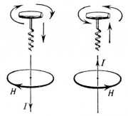 Буравчика правило, удобное для запоминания правило для определения направления магнитного поля, создаваемого электрическим током: если буравчик (с правой нарезкой) ввинчивать по направлению тока (I), то направление вращения рукоятки буравчика совпадает с направлением магнитного поля (Н), возбуждаемого этим током (см. рис.).