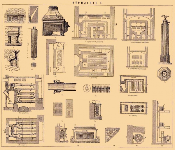 Устройство тех нагревательных приборов, которыми пользуется человек для отопления своих жилых помещений и общественных зданий, представляет крайнее разнообразие по времени и месту. Ниже приводится санитарная оценка, с точки зрения вышеприведенных требований, типических представителей различных систем отопления. В простых кострах, печах с черной топкой, жаровнях и тому подобных способах отопления главный недостаток заключается в том, что они снабжают комнатный воздух огромным количеством как полных, так и несовершенных продуктов горения топлива, производящих, отчасти, местное раздражение на слизистых оболочках дыхательных органов и на соединительной оболочке глаз, отчасти — общее токсическое действие. Более совершенный прибор О. представляет камин, так как здесь продукты горения топлива не переходят в отапливаемое помещение, а выводятся О. через дымогарную трубу. Тем не менее камин, с гигиенической точки зрения, имеет существенные недостатки, так как камин действует исключительно лучистой теплотой, не имеет приспособлений для накопления тепла и ни в каком случае не допускает равномерного распределения теплоты по помещению. Утилизируя, в самом благоприятном случае, около 10 % всей развиваемой топливом теплоты, простой камин и в экономическом отношении не представляет никакой выгоды. Как прибор для вентиляции, он, при известных условиях, может оказать хорошие услуги. Более снисходительно гигиена может относиться к усовершенствованным каминам по типу прибора Дуглас-Гальтона. В таких каминах О. соединено с вентиляцией и они, в сущности, представляют собой местные приборы для воздушного О. со всеми, свойственными последнему недостатками (см. выше).