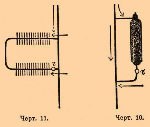 Предпочтительнее цилиндрическая форма. Сосуд снабжается воздушной (с) и сигнальной (е) трубками; обе идут вниз в котельную, причем (е) имеет кран внизу над раковиной. Отсутствие воды в сигнальной трубке указывает на неисправности в системе. Выход пара из воздушной трубки (на ней крана не делается, так как она служит для выхода из системы воздуха) предваряет истопника о том, что температура воды в котле доведена до кипения, и он прекращает или ослабляет топку. Имеются, впрочем, приборы, автоматически уменьшающие топку, как только вода нагрета ею свыше нормы (то есть до кипения). Вспомогательными частями системы служат I) разного рода краны: для уменьшения циркуляции в целой ветви труб или для полного ее изолирования; для регулирования действия местных нагревателей; для спуска воды из закрытой ветви во время починок и, наконец, для выпуска воздуха из системы; 2) воздушные трубки, которые ставятся к трубам там, где в них предвидится скопление воздуха. Эти трубки соединяются и выводятся в одну или около котла, где, в таком случае, имеется воздушный кран, или в расширительный сосуд, что лучше. Они же служат для удаления воздуха из системы при наполнении ее водой. Диаметр их от 3/4 до 1 дм. Одиночных воздушных трубок с воздушными кранами для каждой делать не следует. Для того, чтобы с успехом регулировать температуру каждого отдельного помещения, независимо от соседних, соединение нагревательных приборов с системой труб должно быть произведено так, как показано на черт. 8, 9, 10 и 11. Здесь для регулирования быстроты циркуляции воды, а следовательно, и нагревания, служат краны (r, r, r); при закрывании такого крана изменяется степень нагрева лишь относящейся к нему батареи, вода же в трубах двигается дальше вполне беспрепятственно. Система водяного О. низкого давления дает от 70 % до 80 % полезного действия.
