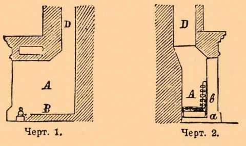 II. Камины. Так называются приборы, действующие исключительно непосредственным лучеиспусканием пламени, то есть топливник их остается всегда открытым со стороны отапливаемого помещения. На черт. 1 и 2 представлены в разрезах два простейших вида камина.
