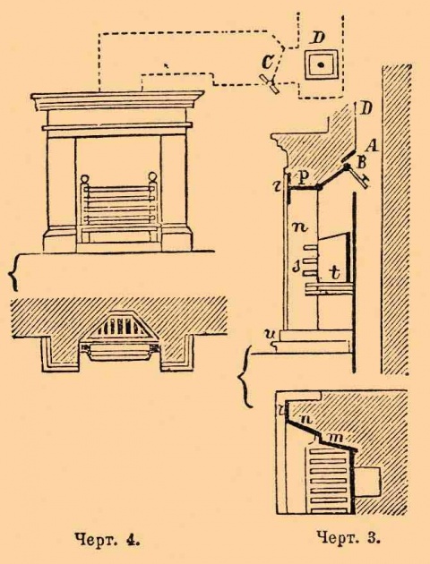 Барьерная (s) и топочная (t) решетки прикрепляются (болтами) к металлической обделке; внизу устанавливается выдвижной ящик для золы (и), а наверху в отверстии (А), сообщающимся с дымоходом, ставится баран В (см. Печные приборы). Если же делается колено (черт. 4), то баран ставится в месте С, а в D делают прочистные дверцы. Камин XII стол., остатки которого найдены в замке Conisborough (Англия), представлен на табл. I, фиг. 1. Начиная с XIV столетия, каминам стали придавать массивные формы. Примеры таких каминов показаны в фиг. 2, 3, 4, табл. I. До XVII в. в многоэтажных зданиях камины часто ставились один над другим, и дым выводился в общую трубу. С половины XVII века в Англии начинают применяться два важных усовершенствования камина: решетчатый под (для каменного угля) и наклонные боковые стенки топливника. Дальнейшие усовершенствования камина все клонятся преимущественно к тому, чтобы воспользоваться частью теплоты дыма: 1) в дымоход ставят металлическую трубу; в нее поступает наружный воздух, и, нагревшись от дыма, выходит через отверстия вверху трубы в комнату (камин Пекле), или отводят дым до известной высоты металлической трубкой, в пространство около которой впускают наружный воздух, выводимый затем в комнату (камины Дуглас-Кальтона и Бельмаса); 2) боковые стенки каминов утолщают и делают в них дымообороты, нагревающие воздух в окружающих эти обороты воздушных каналах. Такое устройство приводит, мало-помалу, к конструкции так называемых камино-печей. Из них укажем на камино-печь архитектора Свиязева. Коэффициент полезного действия каминов, нагревающих только лучеиспусканием горящего топлива и нагретых поверхностей стенок, простирается только от 5 % до 15 %. Затем, какими бы дымоходами и оборотами ни был снабжен камин, нельзя достигнуть полезного действия более 25 %. Площадь поперечного сечения оборотов и дымоходов каминов находится в зависимости от высоты трубы, считая от камина до верха трубы на крыше. При высоте до 4 саж. она должна быть для оборотов не менее 40 кв. врш., а для дымового канала не менее 30 кв. врш. При высоте от 4 до 6 саж. первая — не менее 27 кв. врш., вторая — не менее 20 кв. врш. Для высот от 7 до 11 саж. первая — не менее 20, вторая — не менее 18. Если отверстие каминной топки слишком велико, то камин дымит. Это можно устранить, закрыв часть отверстия частой металлической сеткой. Во время топки камины энергично вентилируют комнаты, но вызывают при очень большой тяге усиленный ток воздуха от окон и привлекают в комнаты испорченный воздух соседних помещений, напр. кухонь. Поэтому, и как вентиляционные приборы, камины оставляют желать многого.