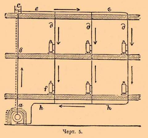 Одной подъемной трубой «b», идущей от котла «а» к расширителю «с» ведут воду на чердак и оттуда (из трубы «е») спускают разводящие вертикальные трубы, (d, d, d), отделяя от них горизонтальные отростки к нагревательным приборам (f, f) и соединяя их с горизонтальной трубой, идущей по подвалу (h) обратно к котлу. Трубы делаются чугунные или железные. Первые соединяются между собой посредством раструбов или, что лучше, флянцев (см. Трубы). Вторые соединяются посредством муфт с нарезками. Горизонтальные трубы следует укладывать с подъемом от 1/100 до 1/200 в сторону расширительного сосуда. С целью дать трубам возможность при нагреве их свободно изменять длину, лучше, укрепляя их к стенам, положить их на ролики, надеваемые на штыри, вбитые в стену. С этой же целью вводят в сеть труб приборы, называемые компенсаторами (фиг. 14, т. I), которые вместе с тем служат для облегчения передвижения отдельных звеньев труб, что делается для достижения большей непроницаемости стыков. Простейший нагревательный прибор водяного О. есть так назыв. батарея с приливными ребрами. Она может быть поставлена горизонтально (фиг. 15, т. I) или вертикально (фиг. 16, т. I), но приливные ребра не должны быть горизонтальными. Цель приливных ребер — усиление передачи теплоты увеличением поверхности соприкосновения с воздухом. Ребра должны быть расположены не ближе 1 дм одно от другого. Батареи не должно располагать по оси циркуляционной трубы, а следует выносить в сторону от нее (черт. 8, 9, 10, 11), чтобы, не нарушая движения воды в трубе, можно было регулировать или прекращать приток ее в батарею. При горизонтальных трубах батареи следует выносить над трубою. Иногда прокладывают две горизонтальные трубы, и батарея помещается между ними (черт. 8); отросток, соединяющий батарею с нижней трубой, снабжается краном (r). Горизонтальные батареи делаются и при вертикальных циркуляционных трубах. В этом случае обыкновенно устраиваются двойные батареи. Батареи выделываются иногда из отдельных элементов, могущих свинчиваться в желаемом числе. Чаще всего батареи располагаются под подоконниками, но могут быть располагаемы и в других местах, у наружных и внутренних стен: первое (то есть у наружных стен) — предпочтительнее, так как устраняет течение от наружных стен холодного воздуха, но имеет и свои недостатки (пятна на стенах). В случае расположения под окнами, идущий от батарей ток теплого воздуха, поднимающийся на некотором расстоянии от стекол, не может уничтожить спускающегося около стекол холодного тока. Поэтому человек, стоящий у окна, чувствует оба тока, что крайне неприятно. Для устранения этого применяется следующее (черт. 6).