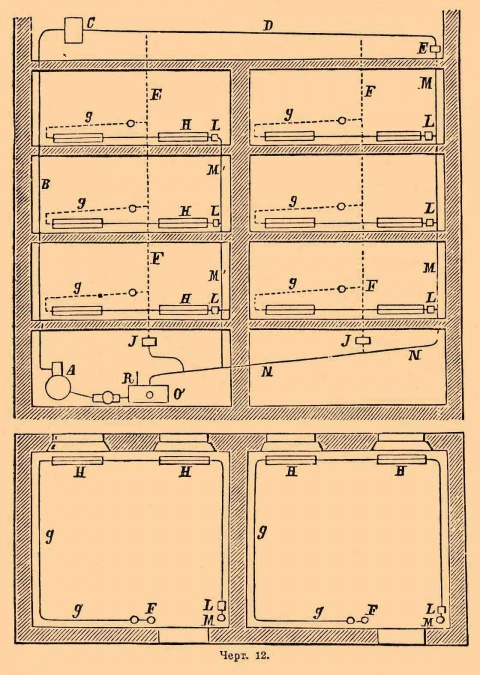 VII. Система парового отопления доставляет зданиям необходимую теплоту посредством пара, циркулирующего по трубам. Пар, охлаждаясь в этих трубах и в связанных с ними нагревательных приборах, отдает помещениям заключенную в нем скрытую теплоту испарения. Этот род О. предложен англичанином Куком в 1745 г., но применен впервые лишь в 1784 г. знаменитым Ваттом и компаньоном его Больтоном. Затем паровое О. получает распространение, но только на заводах и фабриках, где имеется возможность пользоваться отработавшим паром. В 1 828 г. Гей-Люссак, Тенар и Дарсе применяют паровое О. к зданию парижской биржи, но после этого и вплоть до 1872 г. О. зданий непосредственно паром, ввиду многих недостатков, почти не применяется. С 1872 г., благодаря главным образом трудам Женеста и Гершера (О. зданий новой ратуши и нового лицея в Париже, нового суда в Брюсселе и др.), в систему вводятся существенные улучшения, и к нашему времени она числится уже в ряду наиболее совершенных систем. Паровое О. бывает низкого и высокого давления. Первое название имеет место при давлении пара, не превышающем 1,5 атмосферы, к большему давлению относится второе название. Паровое О. высокого давления допускается только в мастерских, но при условии особо внимательного устройства соединений труб. Трубы в этом случае не должны быть чугунными, а котлы выносятся в отдельные пристройки. При паровом О. низкого давления, с соблюдением некоторых мер предосторожности, котлы без опасения могут располагаться и внутри здания; трубы же больших диаметров могут быть сделаны и из чугуна. В состав системы парового О. входят: 1) паровой котел с арматурой (см. ст. Паровые котлы); 2) паропроводные трубы; 3) трубы конденсационные, то есть те, по которым, полученная от охлаждения пара, вода движется обратно к котлу или к водостокам здания; 4) нагревательные приборы и 5) вспомогательные части, к которым относятся: а) регуляторы давления; б) конденсационные приборы, имеющие назначение не допустить проникновение пара в конденсационные трубы; в) различные краны: для регулирования пропуска пара в отдельные ветви труб, для выпуска воздуха при наполнении системы паром, для впуска воздуха при прекращении топки и т. д.; г) прибор для питания водой котла. Подобно циркуляционным трубам водяного О. низкого давления, паропроводные трубы должны быть расположены с соблюдением возможности прекращать или уменьшать нагревание каждого помещения независимо от других. На черт. 12 представлен один из способов распределения по зданию паропроводных труб. Котел А, расположенный в подвале, развивает необходимый пар. От котла поднимается труба В, входящая на чердаке в регулятор давления С. Начиная от него, пар движется по трубе D, постепенно склоняющейся к точке Е, где помещается первый конденсационный прибор. Отсюда труба обратной ветвью NN приходит к баку О, куда отводится вся конденсационная вода системы. По всей длине трубы D отходят в желаемых местах второстепенные парораспределительные трубы F, F, идущие вертикально вниз и имеющие на концах конденсационные приборы JJ, пропускающие воду в обратную трубу N. От распределителей FF отходят трубы GG, снабженные регулирующими (запорными) кранами, ведущие пар к нагревательным приборам HH, за которыми снова расположены конденсационные приборы LL, пропускающие воду в вертикальные трубы M’M, а оттуда в т