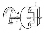 В магнитном тахометре (рис. 2) взаимодействуют магнитные поля, создаваемые постоянным магнитом и вращающимся ротором, частота вращения которого пропорциональна возникающим вихревым токам, стремящимся отклонить на определённый угол диск, установленный на валу ротора и удерживаемый пружиной. Отклонения диска, жестко связанного со стрелкой, регистрируются на шкале. Электрические тахометры могут быть электромашинными или электронными. В электромашинном тахометре эдс генератора постоянного или переменного тока пропорциональна угловой скорости, измерив которую можно определить частоту вращения вала; показания передаются дистанционно на шкалу измерительного прибора. Принцип действия электронного тахометра основан на преобразовании импульсов тока, возникающих в первичной цепи системы зажигания при размыкании контактов прерывателя, в ток, направляемый к магнитоэлектрическому указательному прибору. Частота импульсов в первичной цепи пропорциональна частоте вращения вала двигателя.