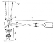 Метод интерференционного контраста (интерференционная микроскопия) состоит в том, что каждый луч, входящий в М., раздваивается; один из полученных лучей направляется сквозь наблюдаемую частицу, а второй — мимо неё по той же или дополнительной оптической ветви М. В окулярной части М. оба луча вновь соединяются и интерферируют между собой. Результат интерференции определяется разностью хода лучей d, которая выражается формулой d = Nl = (n0 — nm)d, где n0, nm — показатели преломления частицы и окружающей среды, d — толщина частицы, N — т. н. порядок интерференции, l — длина волны света. Принципиальная схема одного из способов осуществления интерференционного контраста показана на рис. 6. Конденсор 1 и объектив 4 снабжены двоякопреломляющими пластинками (помечены на рис. диагональными стрелками), первая из которых расщепляет исходный световой луч на два луча, а вторая воссоединяет их. Один из лучей, проходя через объект 3, запаздывает по фазе (приобретает разность хода по сравнению со вторым лучом); величина этого запаздывания измеряется компенсатором 5. Метод интерференционного контраста в некоторых отношениях сходен с методом фазового контраста — оба они основаны на интерференции лучей, прошедших через микрочастицу и миновавших её. Как и фазово-контрастная микроскопия, этот метод позволяет наблюдать прозрачные и бесцветные объекты, но их изображения могут быть и разноцветными (интерференционные цвета). Оба метода пригодны для изучения живых тканей и клеток (и часто применяются именно с этой целью). Отличие интерференционного метода от метода фазового контраста заключается главным образом в возможности, используя компенсаторы, с высокой точностью (до 1/300 l) измерять разности хода, вносимые микрообъектами. Это открывает широкие возможности количественных исследований — на основании таких измерений могут быть рассчитаны общая масса и концентрация сухого вещества в микрообъекте (например, в растительной или животной клетке), показатель преломления и размеры объекта (рис. 7). Метод интерференционного контраста часто сочетают с другими методами микроскопии, в частности с наблюдением в поляризованном свете; применение его совместно с микроскопией в ультрафиолетовых лучах позволяет, например, определить содержание нуклеиновых кислот в общей сухой массе объекта. К интерференционной микроскопии обычно относят также методы использования микроинтерферометров.
