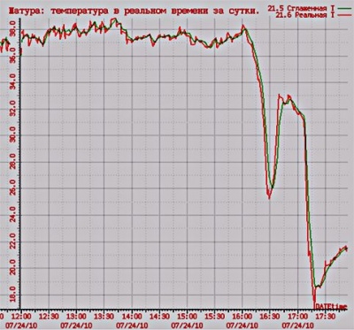 График температуры 24 июля 2010 года с термометра в районе ИПЛИТ РАН. Прошел долгожданный дождь с грозой (второе понижение температуры). Температура понизилась на 20 градусов за 1.5 часа. Метеостанция в Черустях показывает на 15 часов +32.7° и «Гроза, но без осадков», Tmax=+35.8°, в Быково было Tmax=38.3°